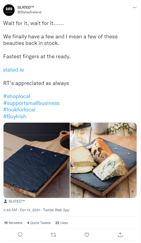 @SlatedIreland使用 #ShopLocal 标签来宣传他们的一款圣诞产品,并暗示产品数量有限。
