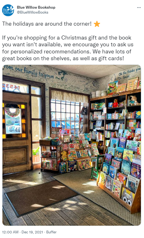 @BlueWillowBooks在圣诞节前与粉丝互动,以确保他们可以在店内找到送给爱人的完美礼物。