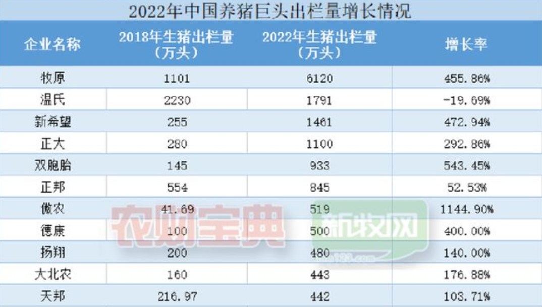 自2018年非洲猪瘟爆发以来,除了温氏集团因种种原因未能快马加鞭,各大养猪巨头纷纷实现弯道超车,养殖规模呈翻倍式增长。其中,新希望增长了4.7倍,却位居第三,之上的傲农、双胞胎分别增长了11.4倍和5.43倍,令人惊叹。